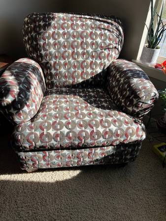 73" long love seat. Thick heavy cushion, very comfortable and in very good condition. Multi-neutral colors. Wide real wood legs. The furniture is very clean and as been well taken care of and never exposed to smoke. Pillows are reversible to match the sofa, chair and ottoman design. Willing to sell separately. Price is always negotiable. You pick up