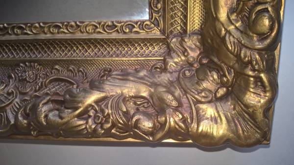 Gilt frame with highly ornamental design motifs including stylized floral and auricular carvings along with detailed geometric and cross hatched patterns. Colors are shades of gold with hints of copper and bronze with a vintage patina. Seem to be trace amounts of gold leaf visible as highlights.