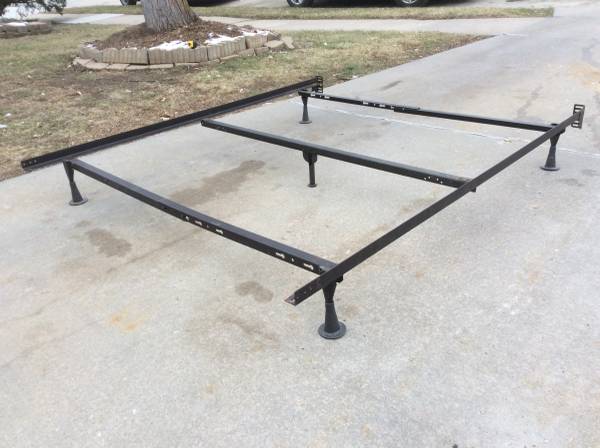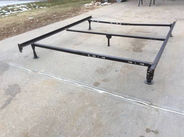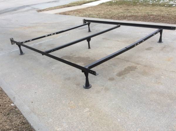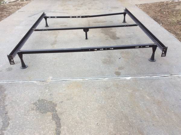 Bed frame adjustable fits queen-full-twin beds. Head board attachments with center support bar with support post in the middle of bar. Folds for easy hauling and setup.