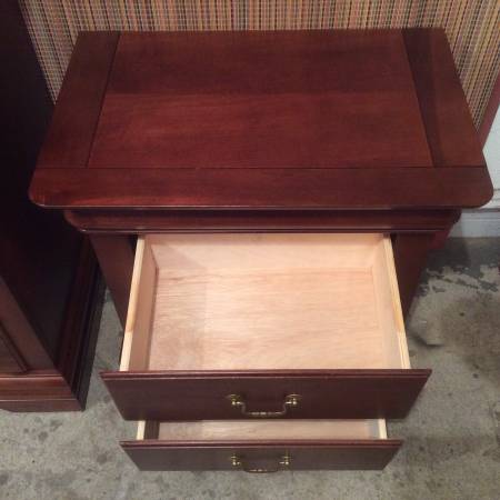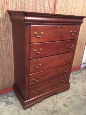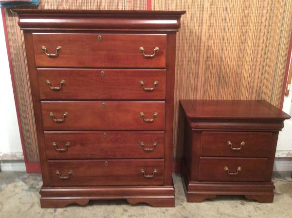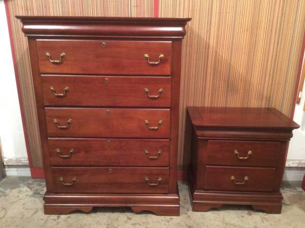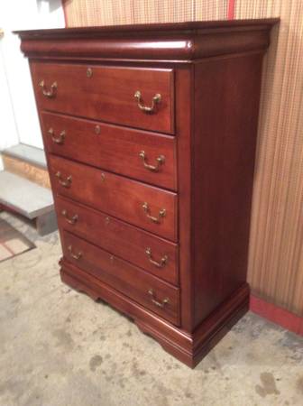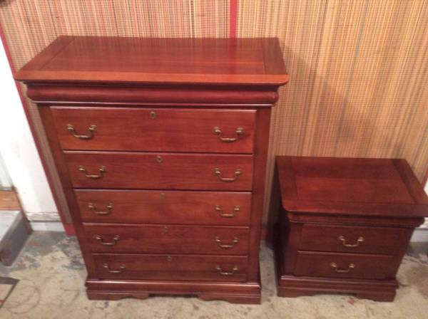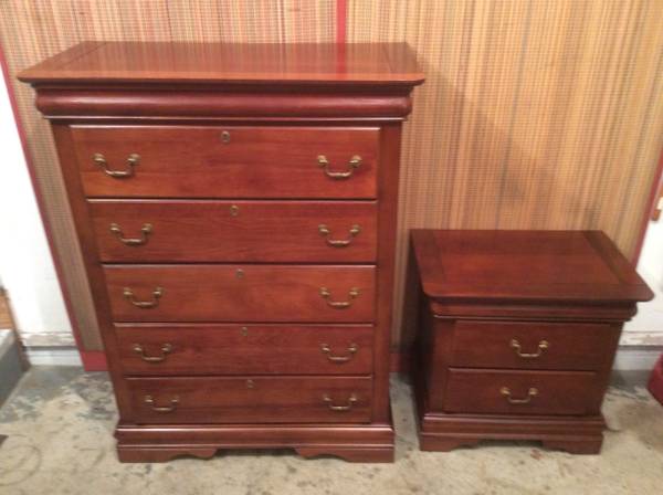 Mint 5 drawer dresser and 2 drawer night stand. Matching cherry finish solid wood furniture. Drawers are made of dovetail joints best there is with 7 ply plywood sides on drawer with solid oak fronts and plywood bottoms in all drawers. Dresser has 2 pulls on each drawers. This set is new condition. Dresser measures 38 inches wide,,,,19 inches deep,,,,50 inches tall.