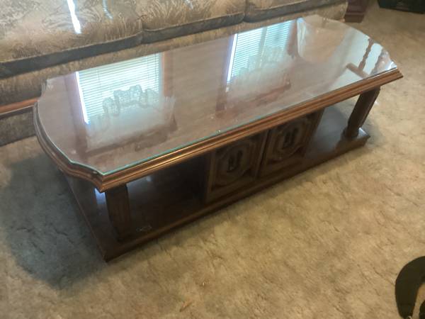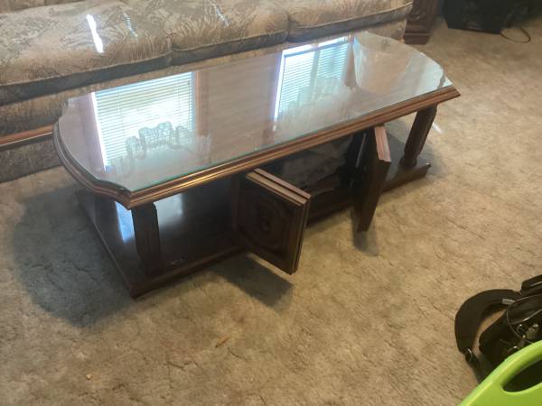 Very nice coffee table no damage have a glass top made for it to protect the top that cost us $40 Coffee table has plenty of storage underneath out of sight and on the ends Cell phone to send me a...