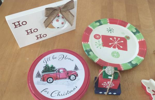 1 Wooden Decor Piece (that says "Ho Ho Ho" and has a Jingle Bell and Bow)