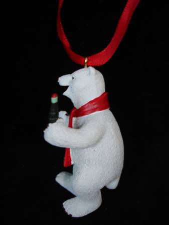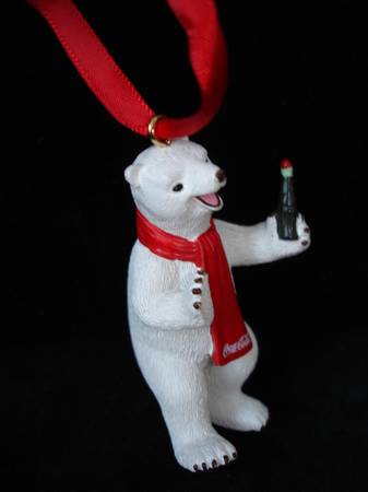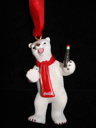 A must for any Coca-Cola collector, this Christmas ornament depicts a white polar bear wearing a red scarf with the Coca-Cola insignia on the bottom of the scarf, holding a bottle of Coca-Cola. Ornament has a red ribbon hanger, measures 2.50” x 1” x 1” and is in excellent condition. Coca Cola carries one of the best-known logos in the world and ranks supreme for soda-related collectibles.