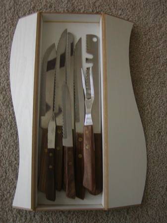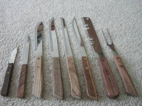 7 assorted kitchen knives and 1 meat fork made of stainless steel with wood handles. Cutlery comes with stylish box.