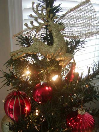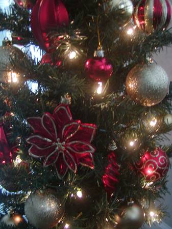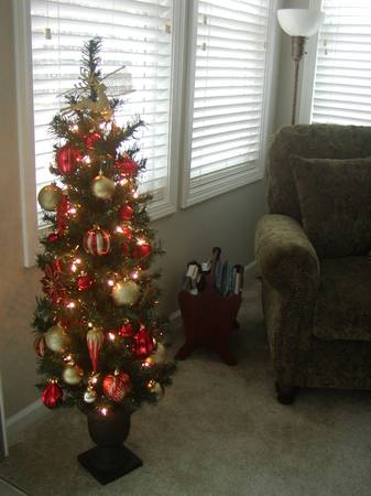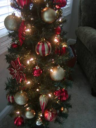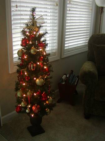 Illuminate any corner of your home, apartment, or office with this charming potted artificial Christmas tree. This porch-style tree by “At Home’s Designer Collection” is slender, simple, stylish, and a perfect size for narrow spaces like a hall or entryway. Tree measures 48” tall x 18” wide/girth, is flame retardant, and comes in an embossed black resin pot that goes with all types of décor. Tree comes fully decorated with 50 clear mini-lights; a variety of satin, shiny, and glittered red and gold ornaments.