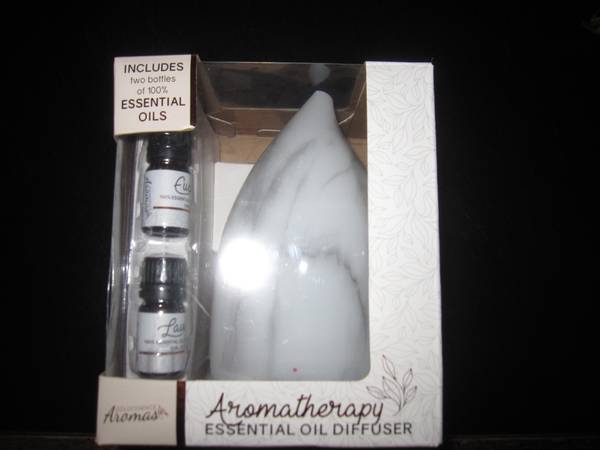 NIB! $10..00 EACH- Aromas Aromatherapy Essential Oil Diffuser each includes two bottles of oil one scent is Lavender and the other Eucalyptus. With color changing LED lights. One is white/gold and the other kinda a white marbled effect. Send your phone # if interested. You can Google this item for more information. Would make a great gift!