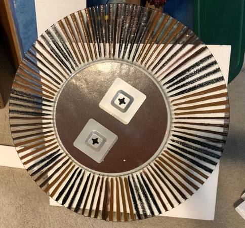 Glass mirror with colors of mustard, brown and dark brown. Measures 29.75" across. Excellent condition! Pick-up near 108th and L St