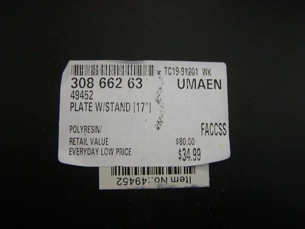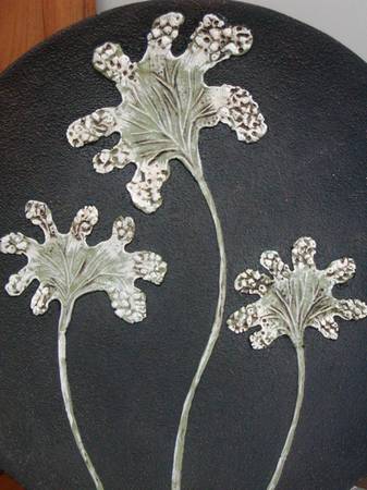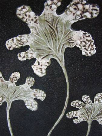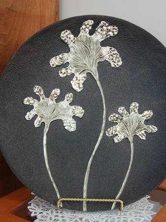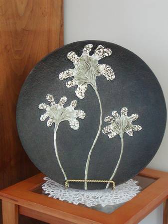 This large decorative art plate is perfect for enhancing the beauty of a variety of spaces and its stylish design will compliment any interior decorating style, becoming a focal point wherever it’s placed. Plate measures 16.5” diameter, made of polyresin, is black with a raised textured foliage motif in off-white, brown and sage green. Comes with a gold-colored metal, double-twisted wire display stand.