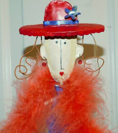 She wears a purple dress with a red hat, red feathery boa and red shoes.