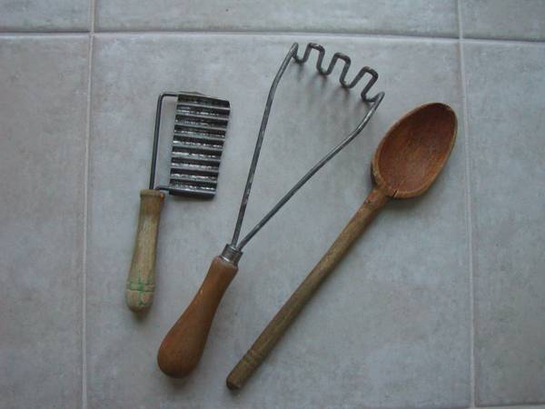 Add a touch of nostalgia, charm and character to your kitchen with these vintage kitchen utensils…Ribbed Potato/Vegetable Slicer (crinkle cutter), Potato Masher, and Wooden Spoon.