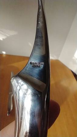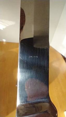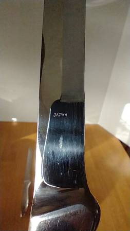 Stainless Steel, Made in Japan. The pieces have some marks consistent with their age and use, and the knives may need to be sharpened. Overall, each piece is in outstanding condition.
