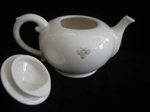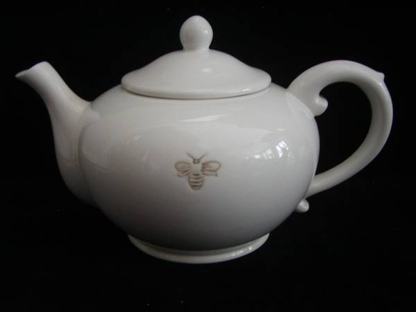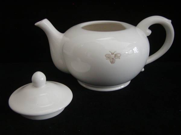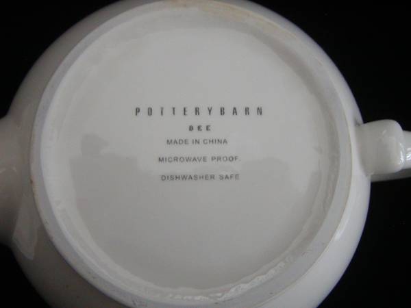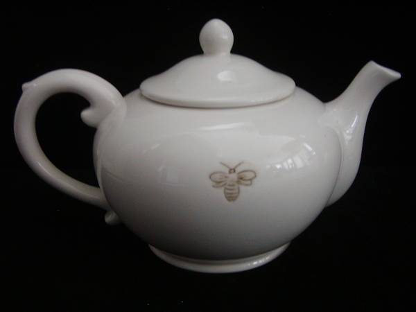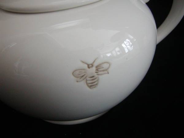 Perfect for tea enthusiasts and collectors alike, this retired ceramic teapot by Pottery Barn is ivory in color with a light brownish-green embossed bee on both sides of the teapot. Teapot measures 6” tall with lid x 9.5” long from spout to the end of the handle and has maker’s mark on the bottom. No chips or cracks.