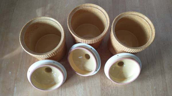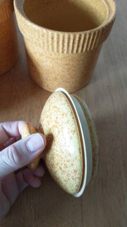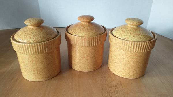 3 Small Orange Speckled Studio Nova Terra Cotta Ceramic Matching Canisters with Lids in Excellent Used Condition (EUC) - $10