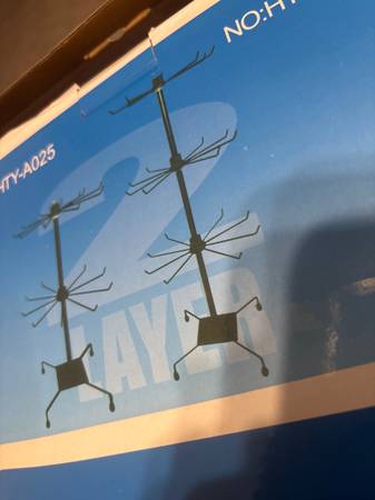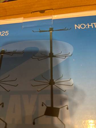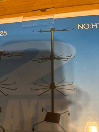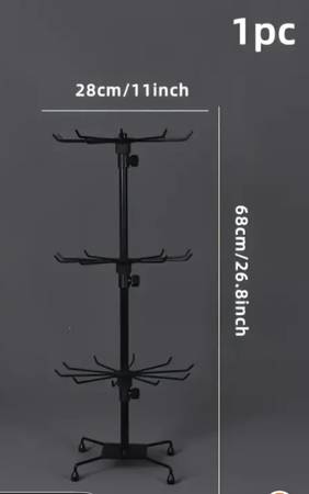 This is a three tier jewelry rack that turns each level terms about 27 inches high 11 inches wide metal black display rack for home or business. Call dave show contact info