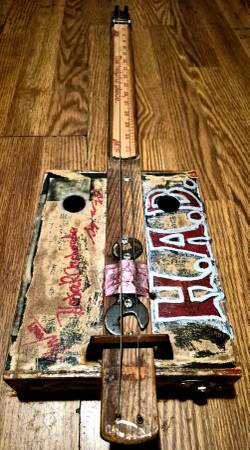 Magnetic pickup...1/4" mono jack...violin friction string tuners.. Ace hardware fingerboard, & a 100 year old "wooden stake" for the neck (sanded smooth)