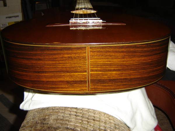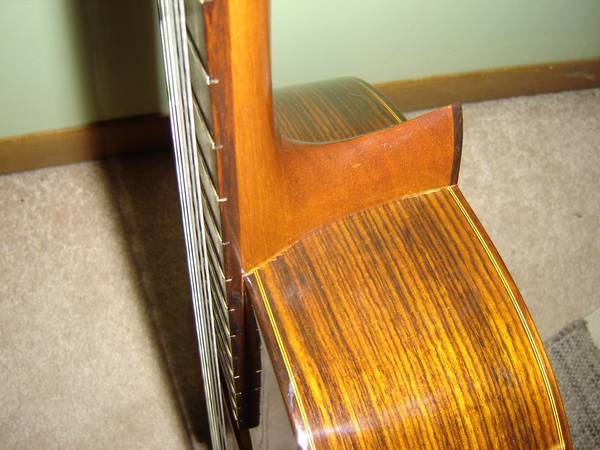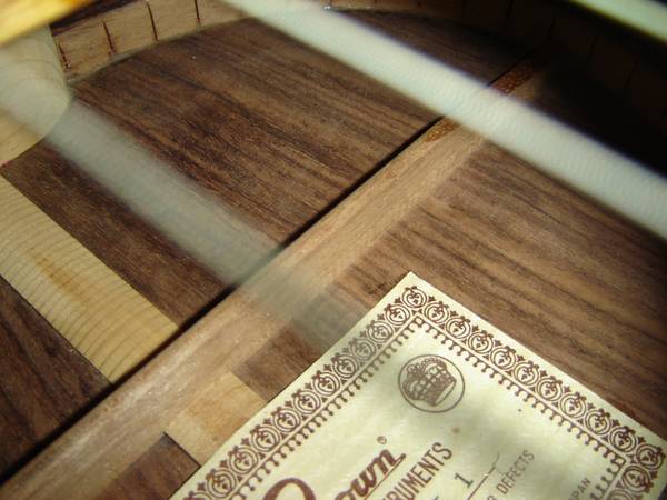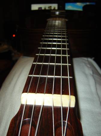This vintage guitar is very easy to play. Neck is straight, no wear or buzzing on the frets. I did have to replace a damaged tuner roller* and a second roller is not an original either. The tuners are still tight and smooth turning. The bridge, neck joint and all the internal bracing is solid. Lightly built top with a 7 fan brace pattern that result in a very resonate top. It has a bone nut and a plastic saddle. There are very few nicks and scuffs you would expect for 50 plus year old guitar, nothing that effects the sound or durability. I cleaned and buffed the finish and applied a coat of Renaissance Wax to the shine it up.