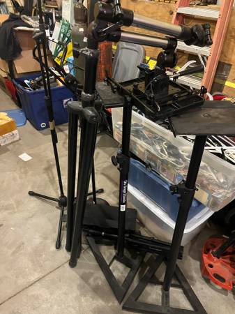 On stage equipment, stands, microphone stands adjustable, all are in excellent condition. great for Musical bans, school other. buy it as a group all for $100 thanks for looking.