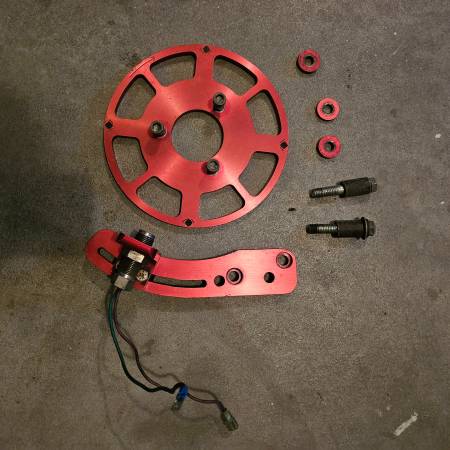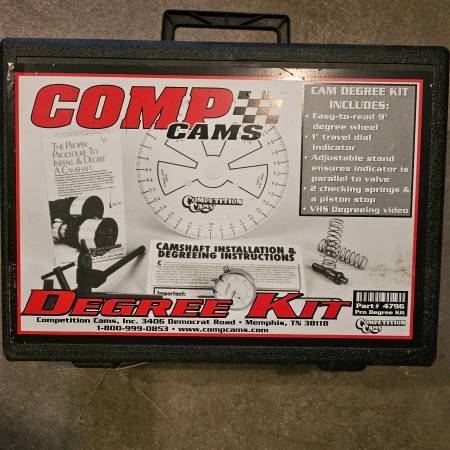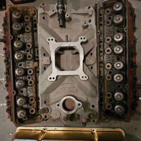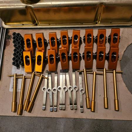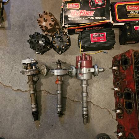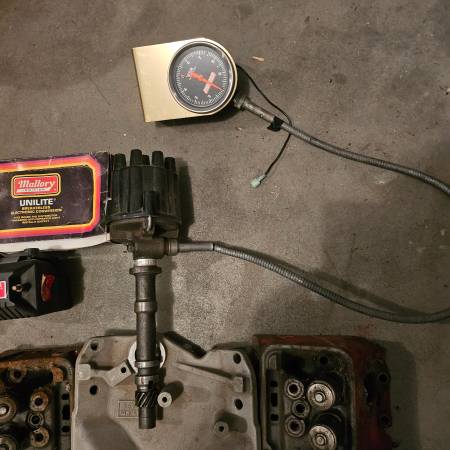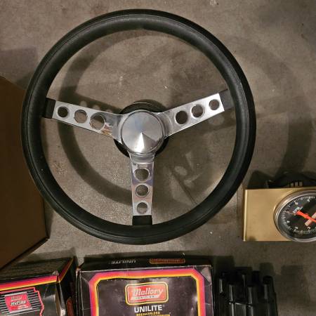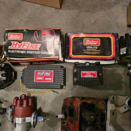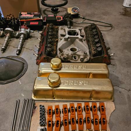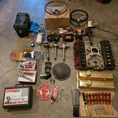 Sbc heads-250.00. / Pushrod guide plates-20.00./ +.150 sbc pushrods-40.00/ Harland Sharp 1.5 sbc roller rockers new-325.00 / gold moroso valve covers with breathers t-bars and spreaders-175.00 / edelbrock sbc torker intake-85.00 / tach drive dist with moroso tach-275.00 / Mallory unilite conversion-40.00 / promaster coil-50.00/hi fire ignition box-50.00 / point distributors- 20.00 each / Mallory dual point dist-40.00 / plastic battery box-10.00 / car hold down straps-30.00 / tire gage 15lb-20.00 / timing chains sbc-10.00 / motor mounts sbc-10.00 / 12 bolt rear cover-20.00 / 66 chevelle ashtray-80.00 / BBC crank trigger-125.00 / fuel filter-10.00 / model cars- 30.00 each / comp cams degree kit-100.00 / 13" steering wheel with gm adapter-50.00 / mid to late 60's GM tan soft grip steering wheel-175.00 I would take 1900.00 for all of this if someone wants it all. Call Kevin at show contact info