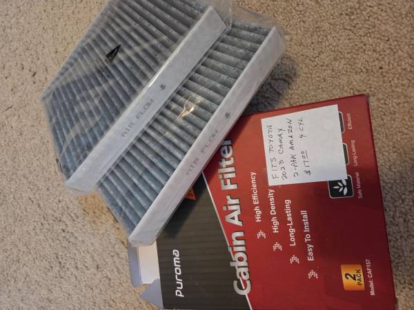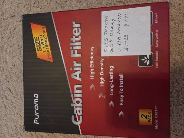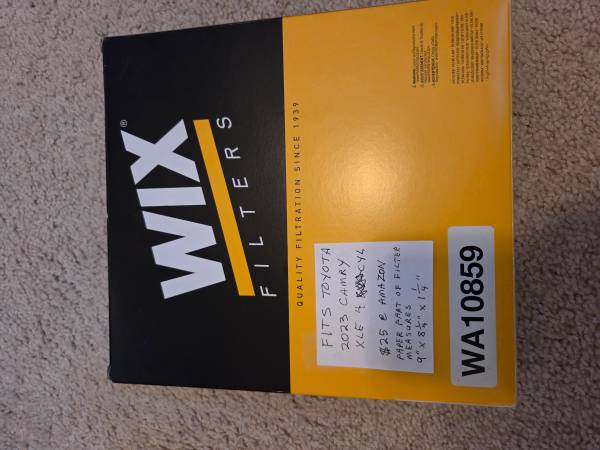 NEW IN BOX 1 WIX ENGINE AIR FILTER AND 2 CABIN AIR FILTERS. FITS 2023 CAMRY XLE 2.5 LITRE 4 CYL 203 HP. $20 CASH FIRM FOR ALL.
