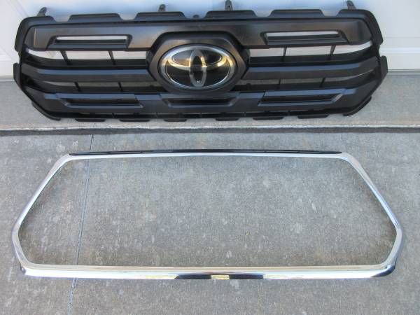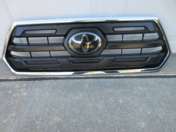 I have in New Condition, a Toyota Tacoma matt black front hard plastic Grill, comes with the center Emblem, and comes with the chrome plastic bezel ring, fits vehicles from 2018 thru 2023, part# on Grill is Toyota 53114-04190--849786 matt black, chrome Bezel ring s/n is 303402147, asking $150.00, call or text: 402-680-402-eight, can meet you in Council Bluffs Lake Manawa at the TSC-Tractor Supply Co. parking lot, ( 329 Veterans Memorial Hwy ) Grill located in Oakland, Iowa.
