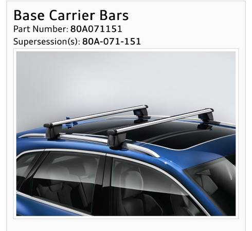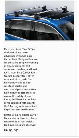 New never used. Came with the car when purchased. Base Carrier Bars for Audi Q5 os SQ5 Part number 80A071151 Still in original packaging from dealer. Retails new for $477.00 plus shipping from a...