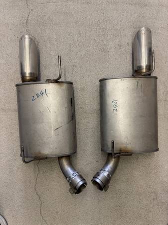 A pair of factory mufflers removed from a 2007 Shelby GT 500 with less than 5,000 miles on them. Had added the chrome exhaust tips on the back with SHELBY embossed on them. They were removed to have aftermarket ones installed. Asking price is $50 each with local pick up ONLY