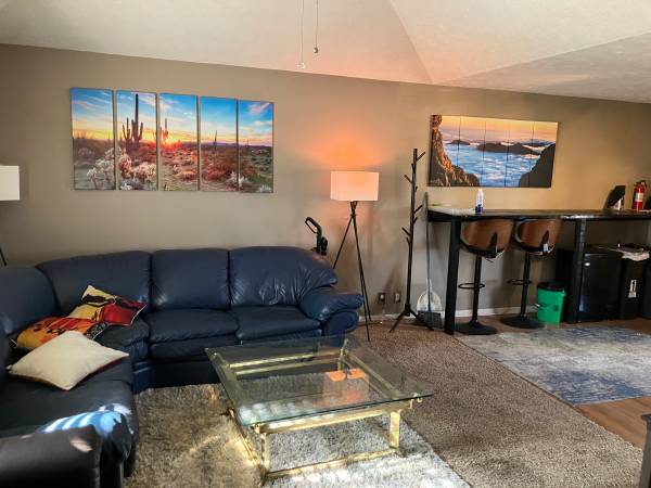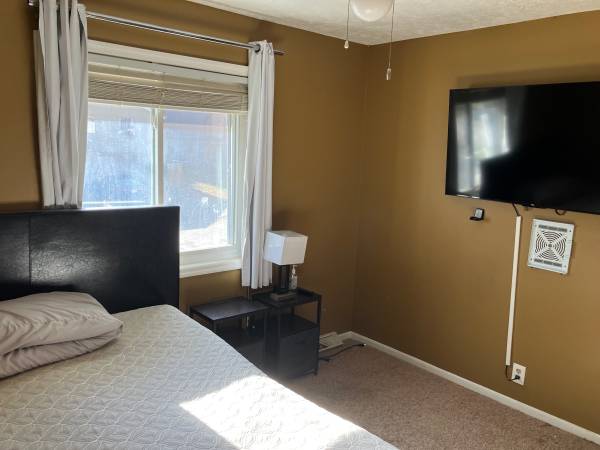 The Bedroom is 15 x 12.5. Fully furnished with never been used queen sized bed, 42 inch smart TV, two side tables, and a good sized closet. Washer and dryer provided. You can use your own furniture if you like.