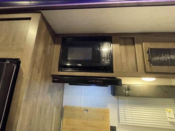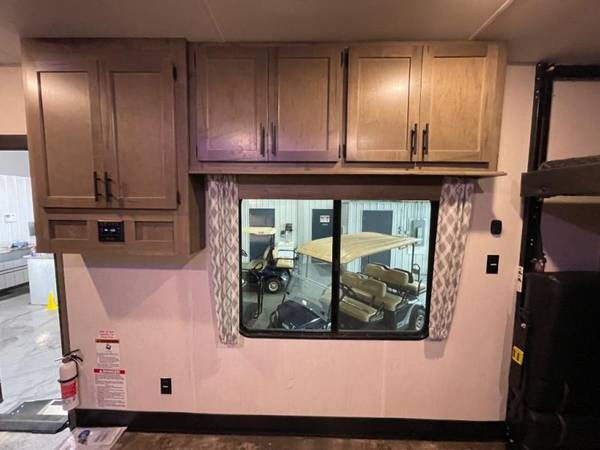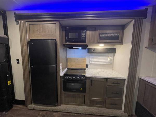 This toy hauler is ready to take you on your greatest adventures! With a 15' garage area, a 84" x 96" ramp door "party patio", and a reverse activated light and backup camera, you can easily load and unload your toys. The exterior 30 gallon fuel station will keep your toys fueled and the three burner cooktop and 10 cu. ft. refrigerator will keep your family fueled. Everyone can freshen up in the dual entry bathroom with the radius shower then play a few card games at the folding dinette table while also enjoying the entertainment center across from it. The front private bedroom welcomes you to lay your head on the 67" x 74" Wolf Pack king bed for a good night's rest!
