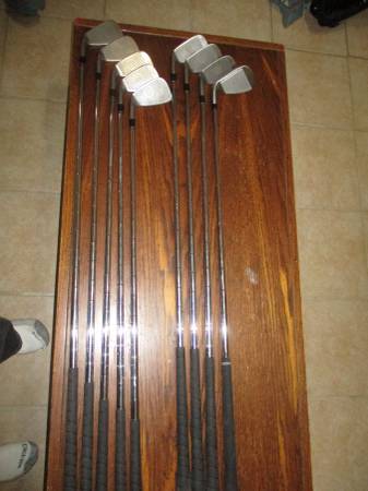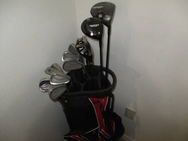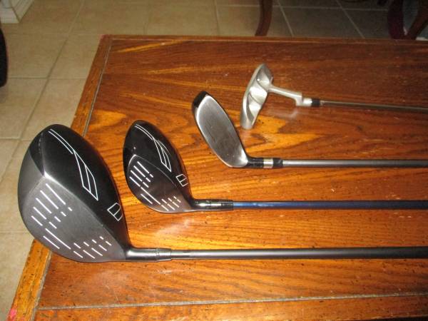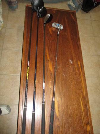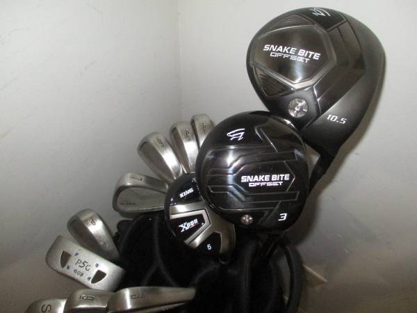Excellent RH Men's King Snake oversize irons: #3,4,5,6,7,8,9,PW,SW, plus Putter. Irons have stiff flex steel shafts. New Snake Bite Driver has 10.5 degrees loft; New #3 FW Wood; New #5 Hybrid. Woods and Hybrid have stiff flex graphite shafts and head covers.