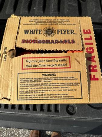 For Sale: 2 unopened cases of White Flyer clay targets (90 ct) and approx 1/2 case of White Flyer that are bio-degradable. Included are 3 hand held throwers which work very well. Price firm and cash...