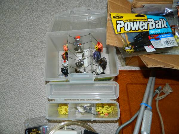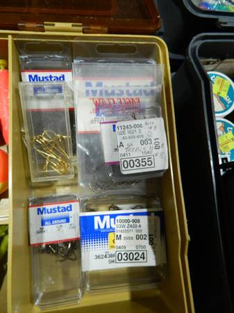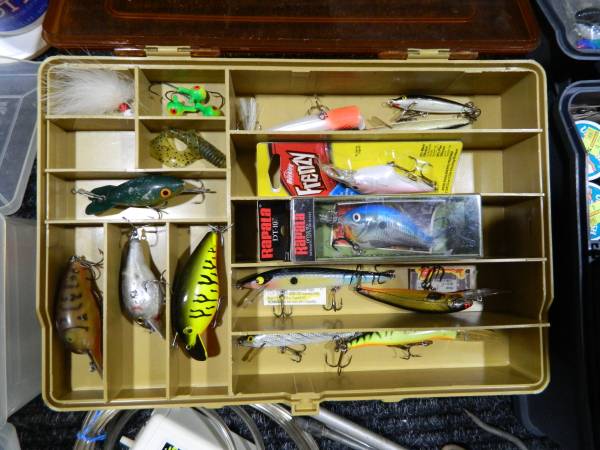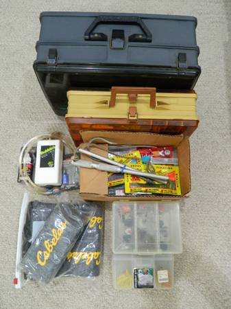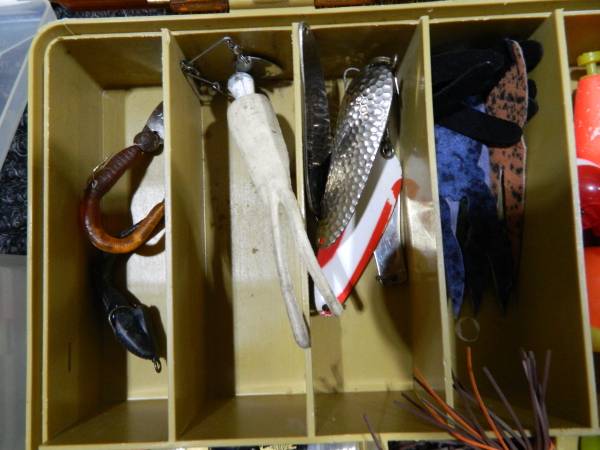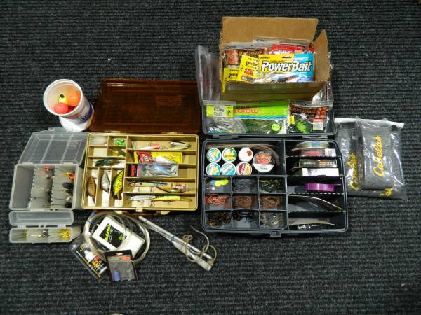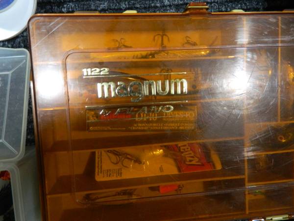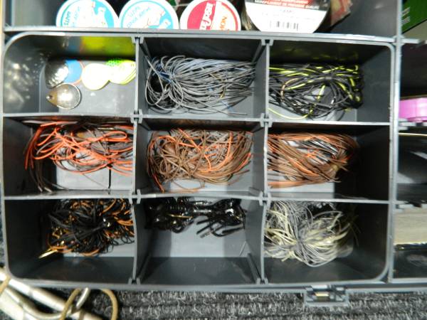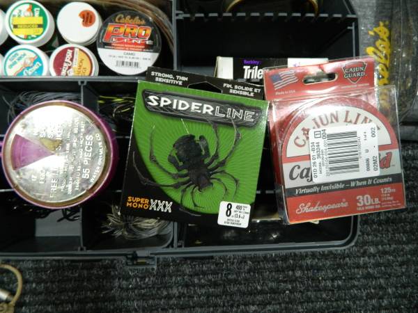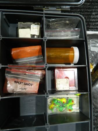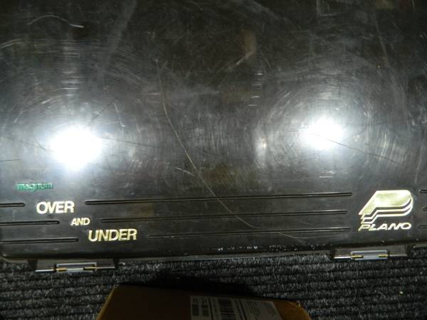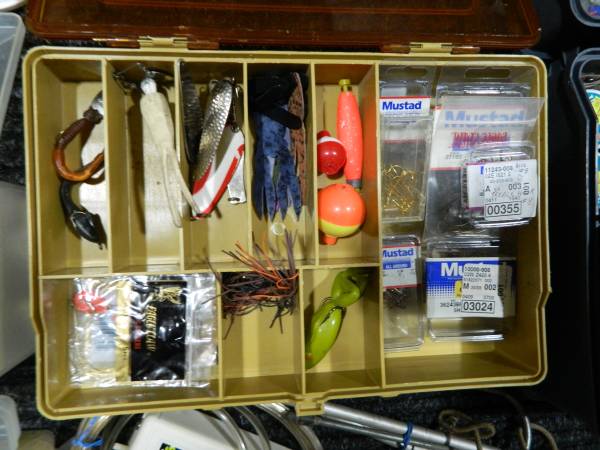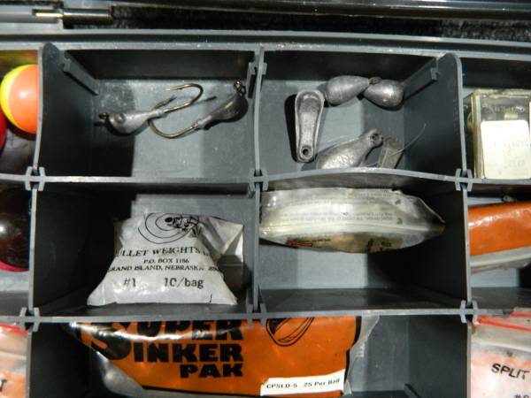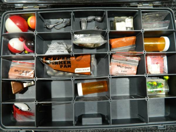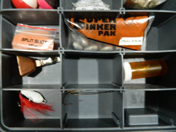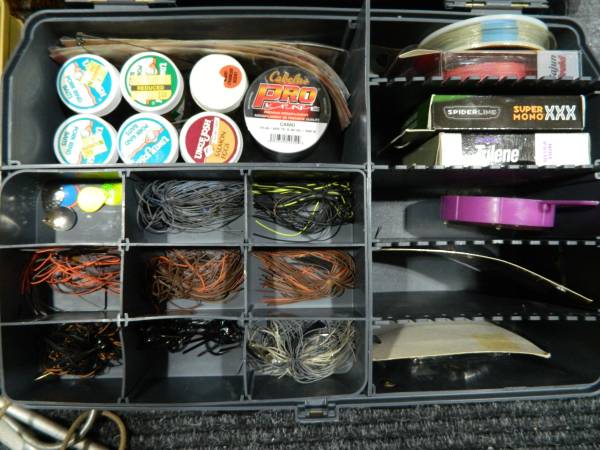 > I Plano Magnum Over and Under filled with spooled fish line (braided & nylon), jigs, hooks, lead weights, etc;
