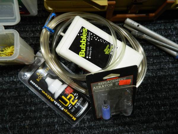 > Bubbles live bait aerator (size D battery operated) with tubing and new replacement filter + New bottle of Bait Booster;