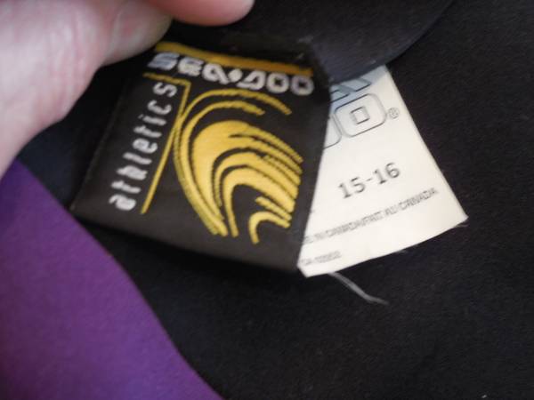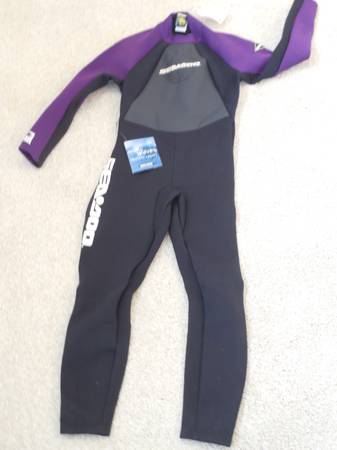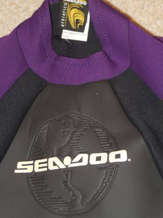 Selling a BRAND NEW See-Doo Athletics brand 2mm thick Neoprene Canadian Wetsuit with tags in Women's size 15 - 16. Colors are black and purple.