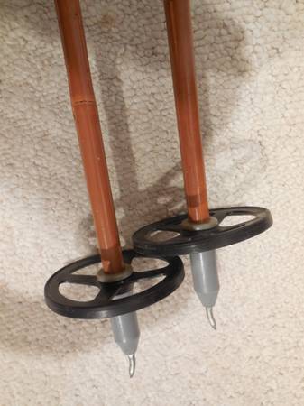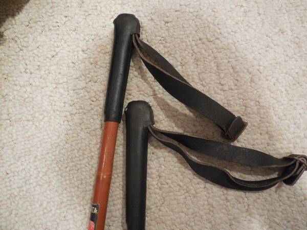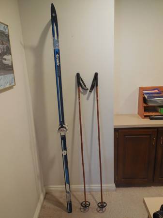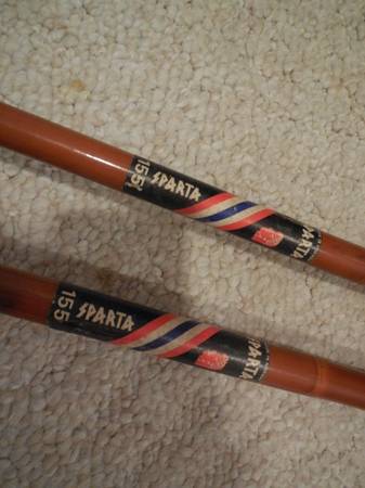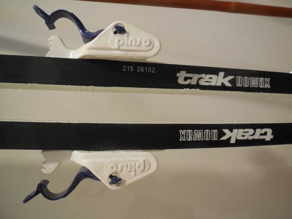 Skis with 3 Pin Trak Pinso bindings in 215cm, plus Sparta 155 bamboo poles. All in excellent condition. I bought this waxless retro ski set NEW in the late 1970s. The pole leather straps have become stiff over the years, so could use a leather conditioner.