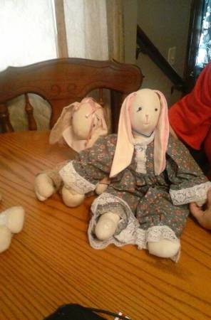 These are all handmade with the exception of the pink one I am asking $25.00 each any child would love their bunny doll. Please leave a phone number.
