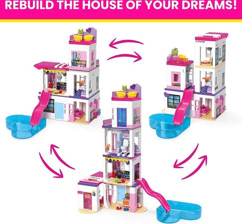 DreamHouse features 8 modular areas that connect to build a 3-story home with 10 areas of indoor and outdoor play, including a buildable working elevator, a pool with slides, furniture, convertible and much more