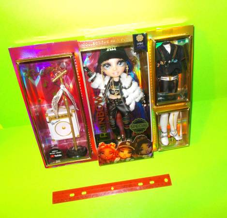 Doll comes wearing a white faux fur jacket with rainbow thread stitching,