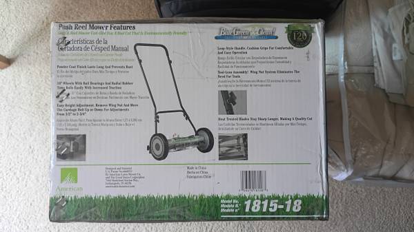 First come first served. No holds. Cross posted. New In Box (NIB) American Lawn Mower Model 1815-18 18" 5-Blade Push Reel Lawn Mower + American SK-2 Sharpener - $110 Retail price for mower is...