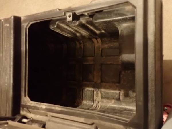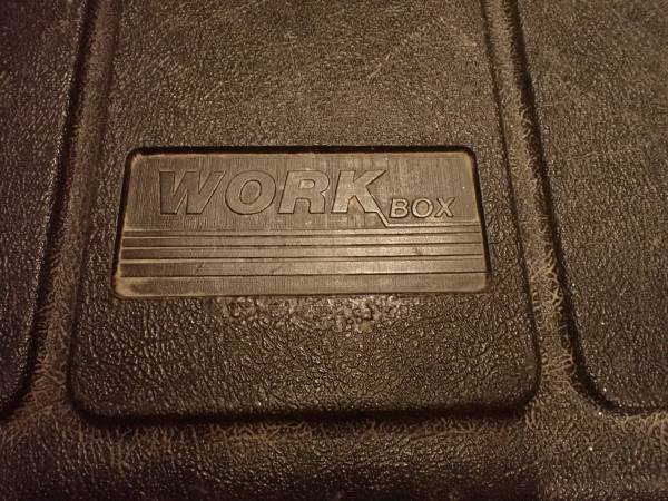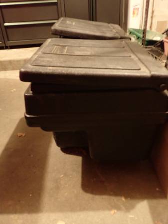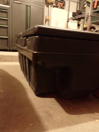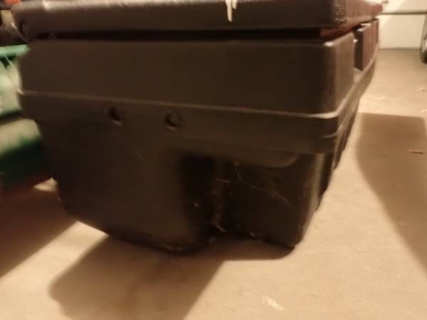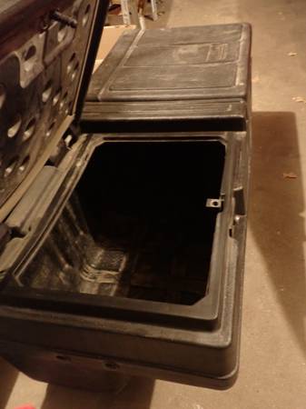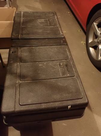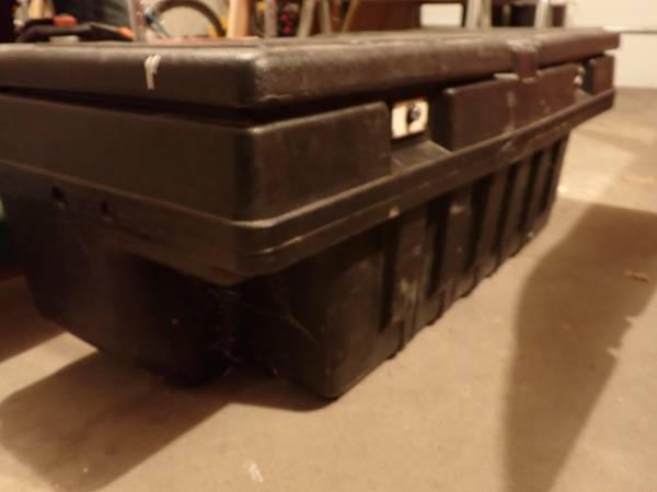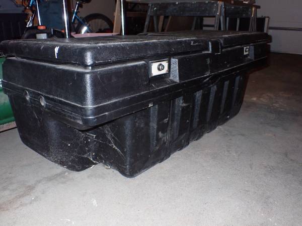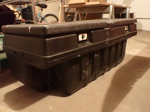 This is a tool box designed to sit in the back of a truck bed for a smaller-sized pick up. Still in good shape. It has two lids that open when the front buttons are pushed, the interior is all one open compartment. We lost the keys years ago so it no longer locks. One of the lid springs shifted and created a hole in the top of one of the lids. Otherwise there are no other holes or cracks visible.