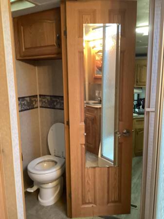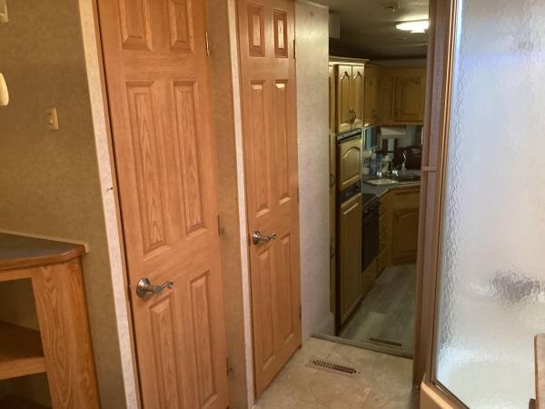 The main bedroom is up a flight of 2 stairs. It greets you with a comfortable queen bed. {We have a Sleep Number Bed at home and were never uncomfortable on this mattress}. In the space on the floor beside each bed, we often have had small grandchildren sleeping on a pallet of blankets beside us. We just had to watch our step when we got up. Lifting the mattress, you will find a large, boxed storage area. Above the bed is a row of 4 cabinets. There is a nightstand with drawers at the side of each bed. Beside the closet is a smaller triangular, open-shelved unit. There is a full, hanging closet in the room. There is a longer accordion door for the use of separating the bedroom from the bathroom area. The bathroom area is also up the 2 steps. The vanity contains a sink big enough for me to wash my short hair in. Above that, is a mirrored cabinet. There is a triangular shower/shallow tub. There is a private toilet room. Also at the top of the 2 steps is a smaller accordion door that gives privacy to the entire upper area.