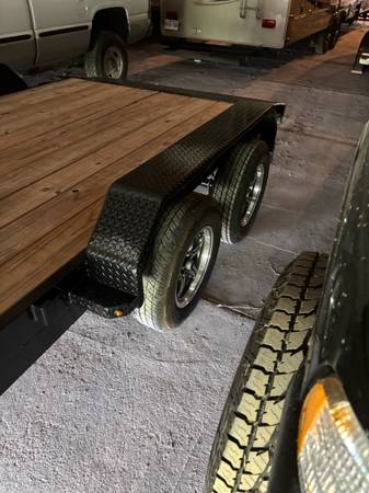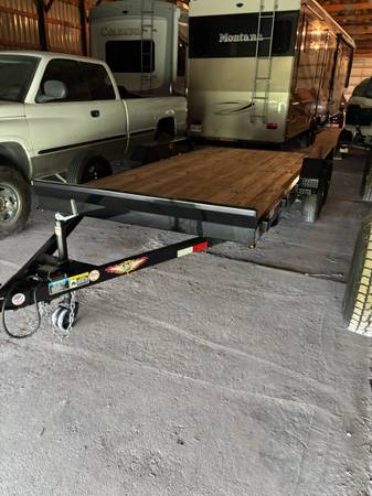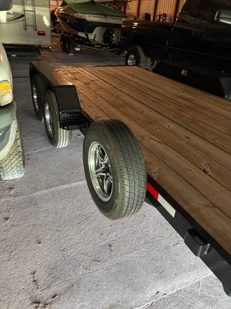 New 2026 H&H car trailer 7X14ft+2ft dove tail 16ft total length has upgraded aluminum wheels with stainless steel, lug, nuts, and stainless steel safety chains it has two 3500 pound axles with brakes on both 7000 pound trailer LED lights the original steel wheels and tires(4) go with it purchased one month ago it’s been in side out of the weather was going to go pick up a car and the deal fell through any questions please ask $4800.0