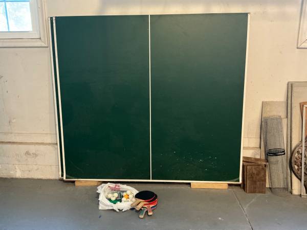 Ping pong table top for pool table with net, balls and paddles. Some damage on the corners. Net has been taped back to bracket but stays on. Comes in two pieces and is fairly heavy. No delivery...